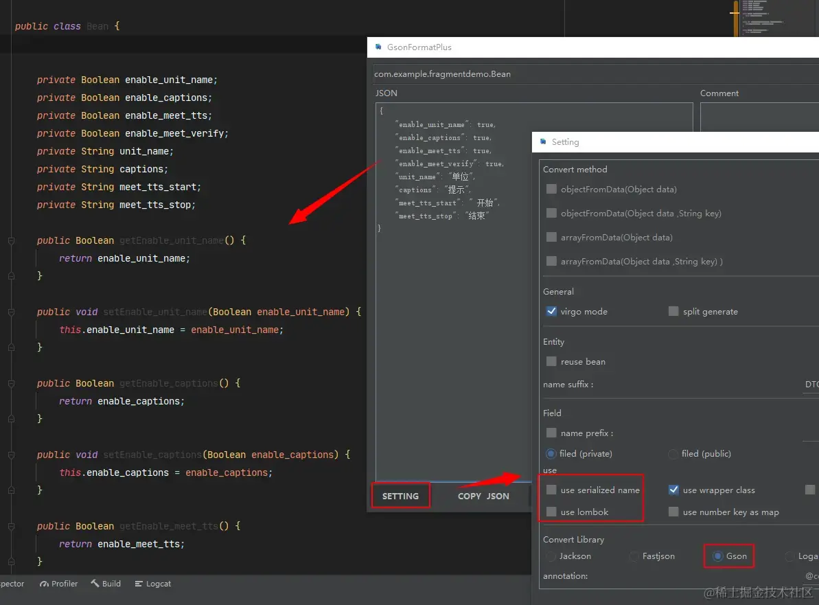 ③ 在弹窗左下角打开 SETTING,插件默认生成的是使用序列化的名字和lombok,按照下方图片改为生成Gson的配置,OK之后就自动生成了Java实体类了。