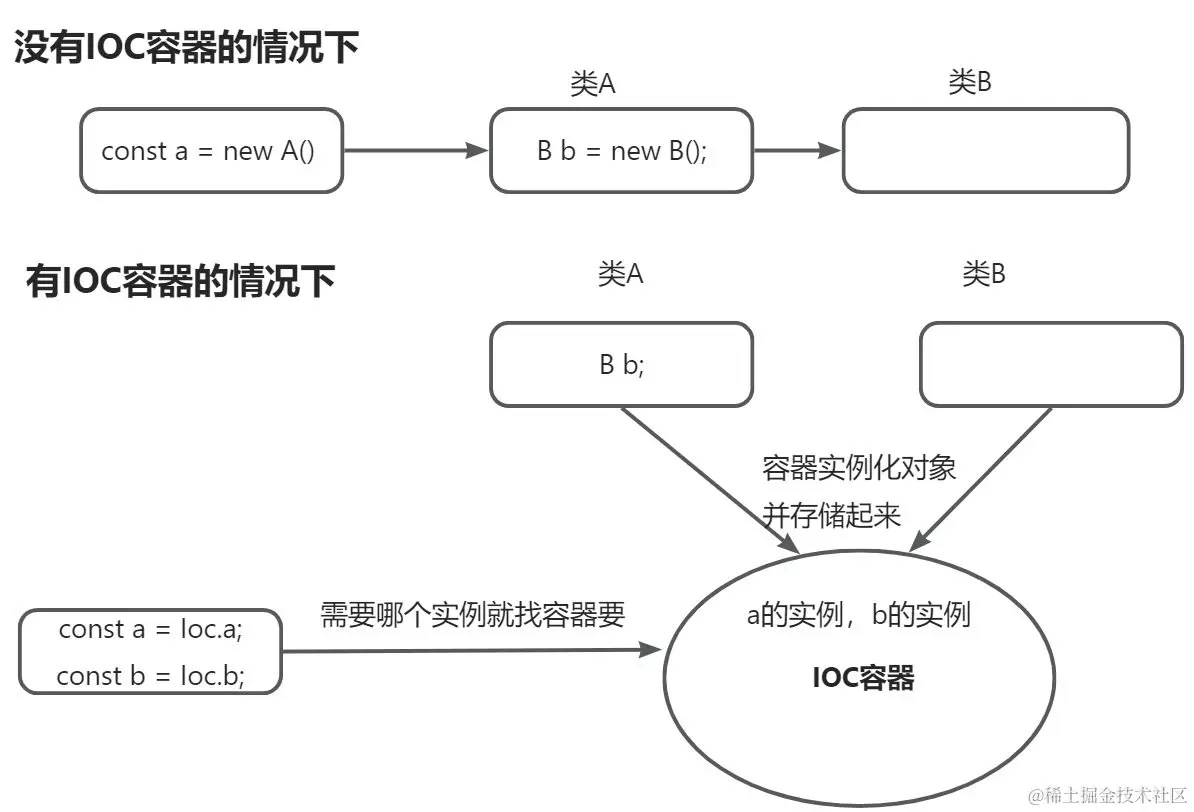 // 假设设置一个IoC容器,将 A 和 B 都注入到IoC容器中