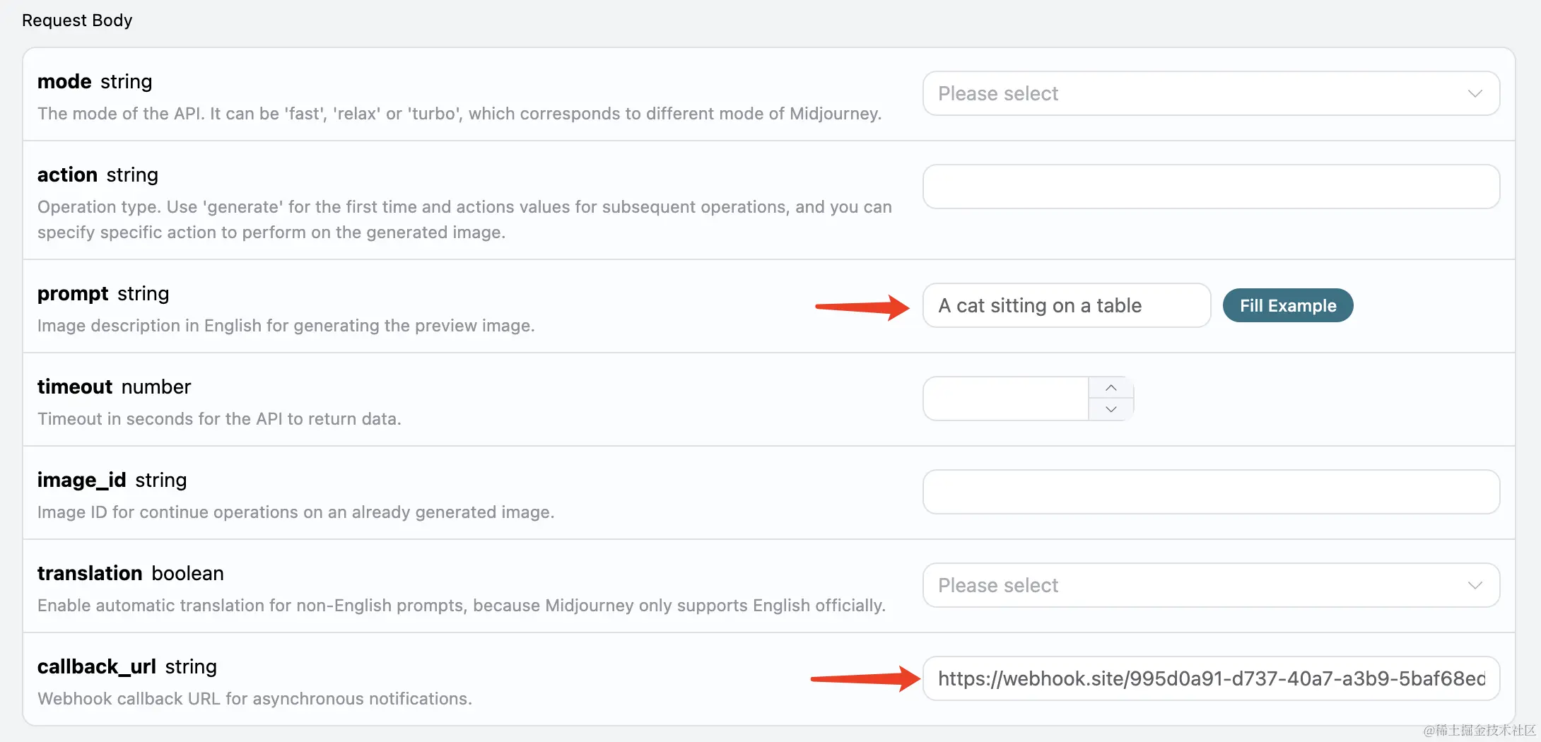 接下来,我们可以设置字段 callback_url 为上述 Webhook URL,同时填入 prompt,如图所示: