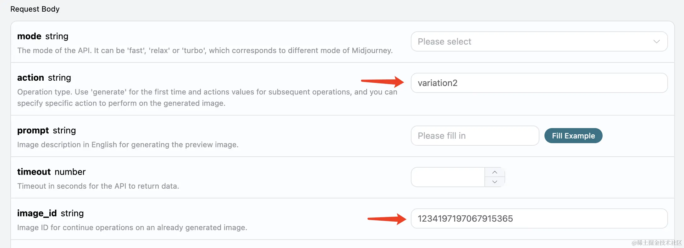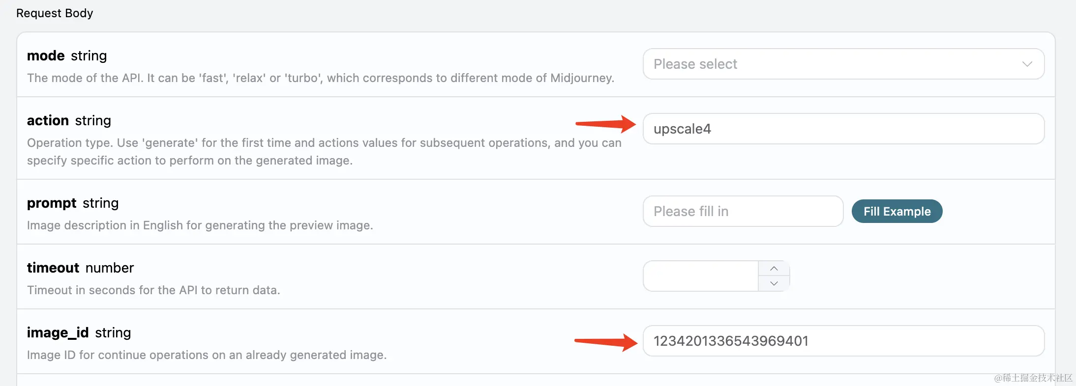 这时候我们可以挑选其中一张进行精细化地放大操作,比如选第四张,那就可以 action 传入 upscale4,通过 image_id 再次传入当前图像的 ID 即可。