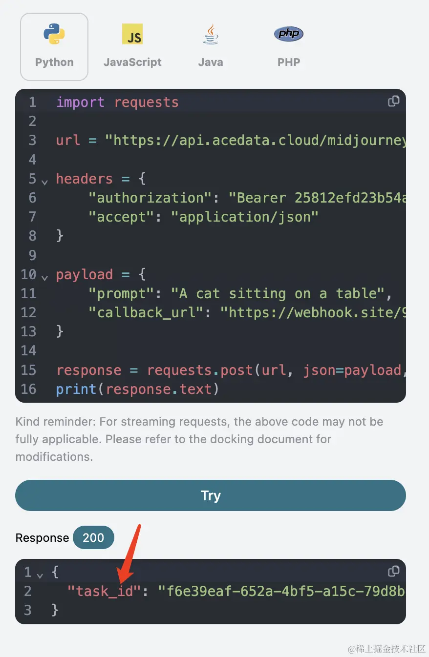点击测试之后会立即得到一个 task_id 的响应,用于标识当前生成任务的 ID,如图所示: