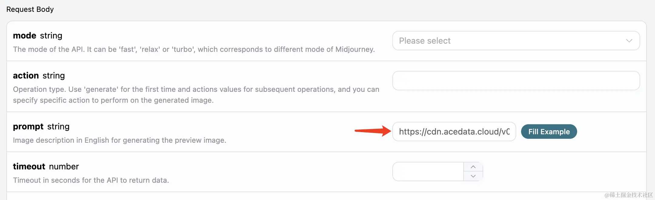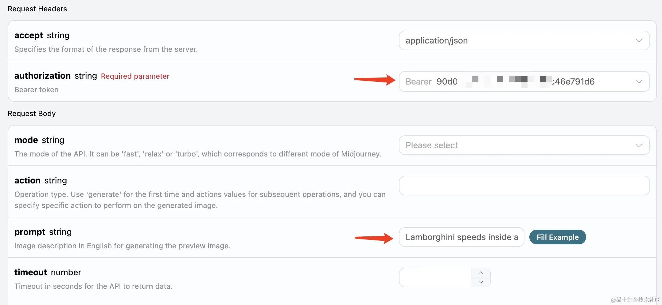 在第一次使用该接口时,我们至少需要填写两个内容,一个是 authorization,直接在下拉列表里面选择即可。另一个参数是 prompt, prompt 就是我们想生成的图片描述内容,建议用英文描述,画的图会更准确效果更好,这里我们用了示例内容 Lamborghini speeds inside a volcano,代表要画一个兰博基尼在火山飞驰。