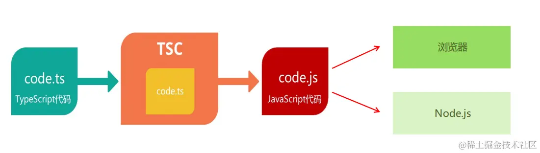 Node.js/浏览器,只认识 JS 代码,不认识 TS 代码。需要先将 TS 代码转化为 JS 代码,然后才能运行