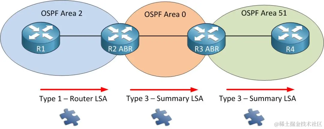 Network-summary-LSA(网络汇总链路状态通告,Type 3)在OSPF协议中扮演着重要的角色。这种LSA类型由ABR(Area Border Router,区域边界路由器)生成,并主要用于描述OSPF区域内某个网络段的路由信息,然后将这些信息通告给其他区域。