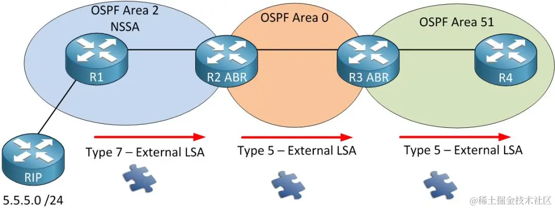此外,NSSA还提供了一种机制,允许将某些NSSA LSAs转换为Type 5 LSAs,并引入到OSPF AS的其他区域。这种转换通常发生在NSSA与其他区域的边界路由器(ABR)上。通过这种方式,关键的外部路由信息可以在需要时被引入到其他区域,而不会对整个AS的路由表造成过大的负担。