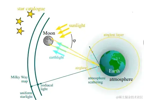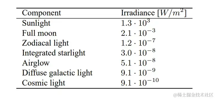 可以看到满月相对其他夜空光源来说是具有统治地位的,而黄道光,星光和气辉逐步降低,再往后我都不知道是啥了。这里我们要发挥一下图形学神功的精髓-大胆而无耻的假设,除了月光,其他就先当做不存在。