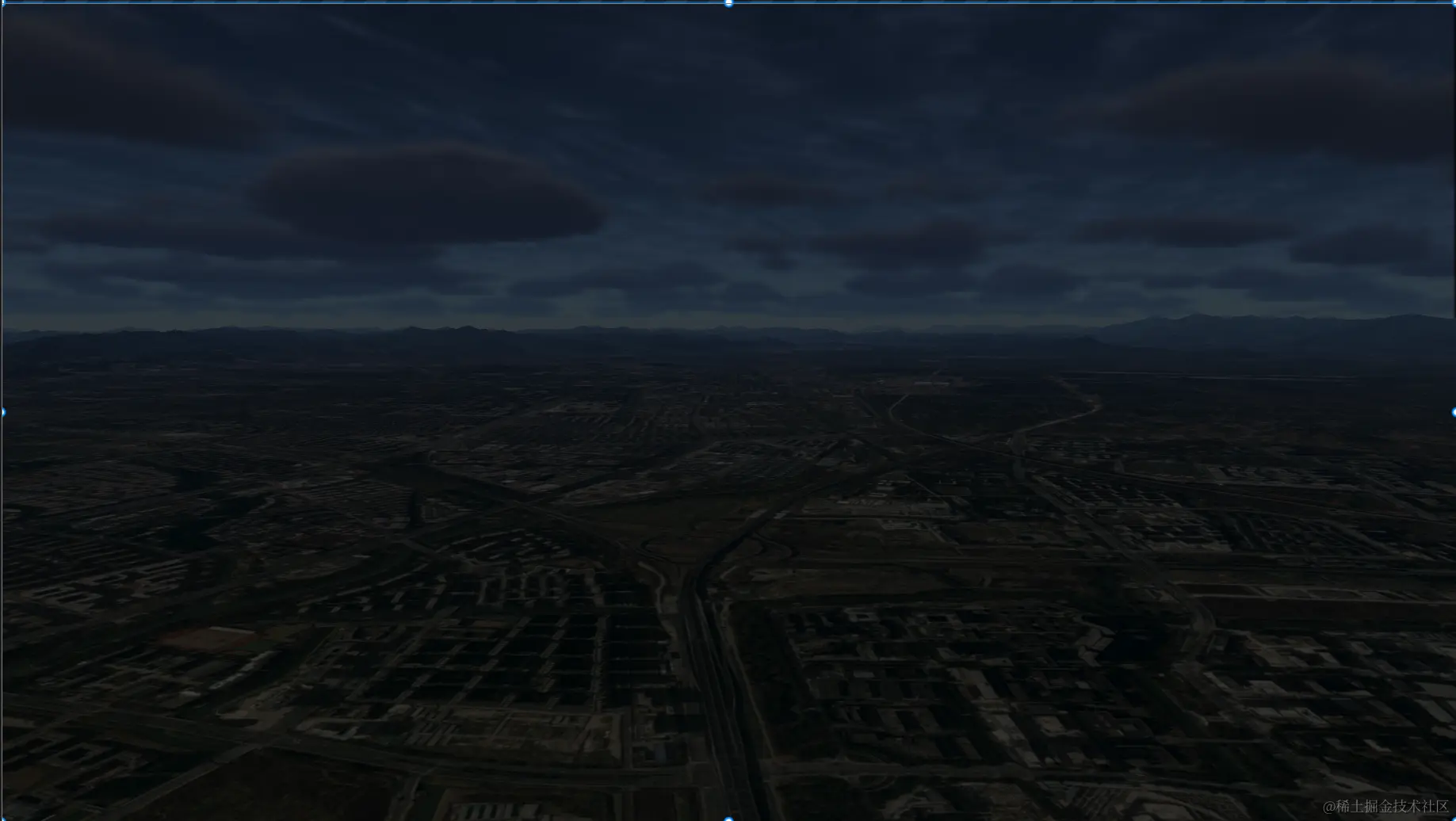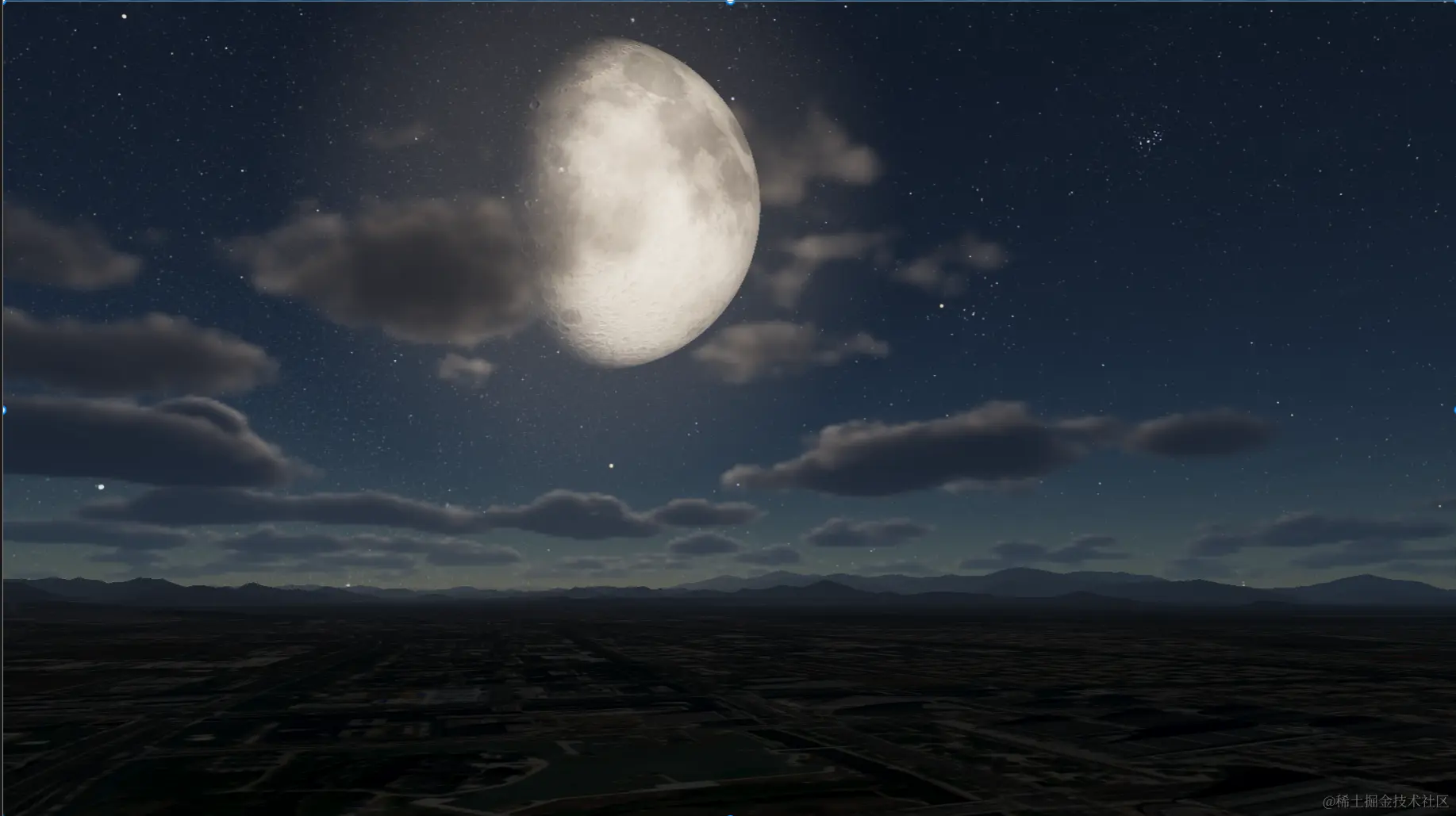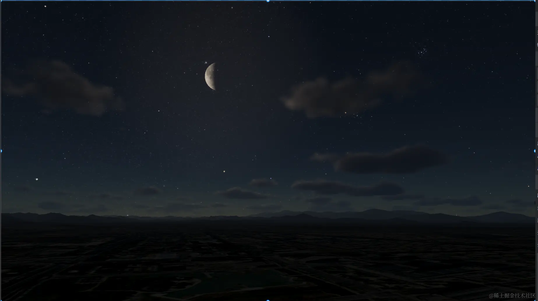这样可以进一步增强清晨和黄昏的视觉层次感。到此,整个山海鲸的夜空实现就已经全部完成了,而空气透视和Cesium系统已经自动叠加,因此不需要再做更多的处理就可以很好的和gis系统融合在了一起。