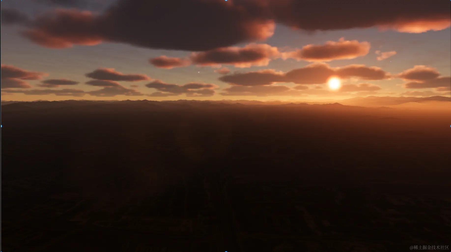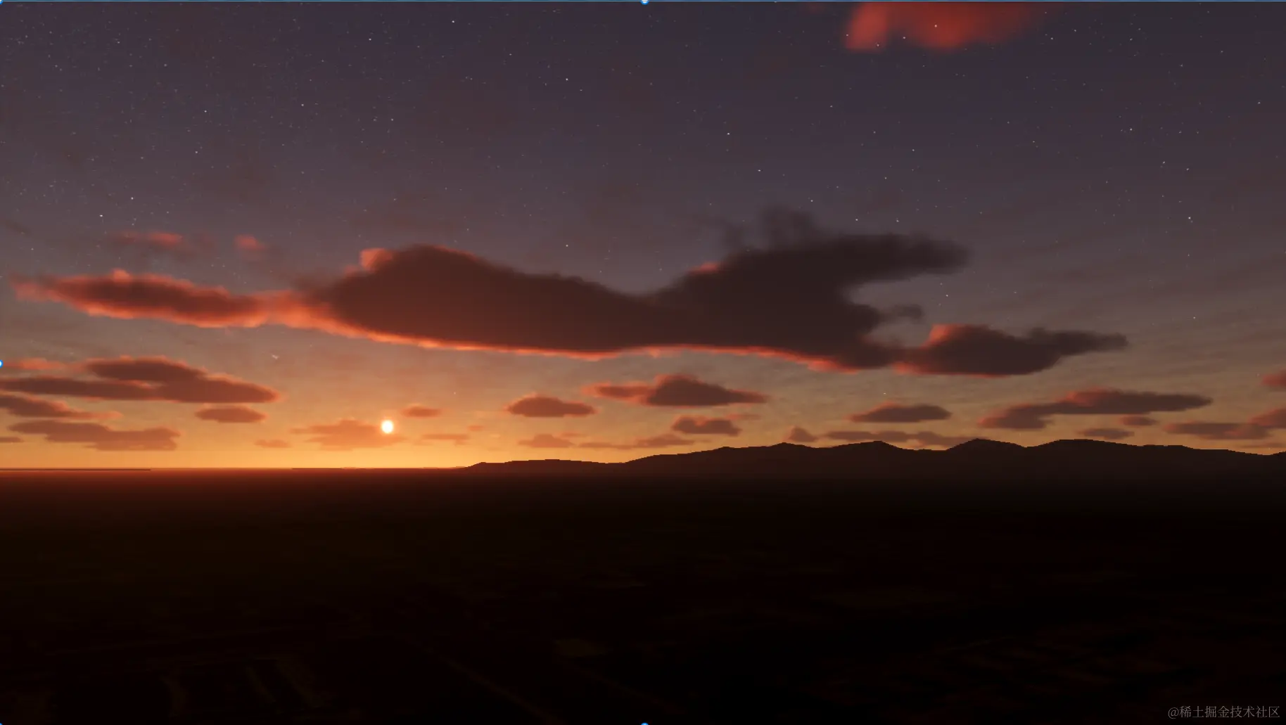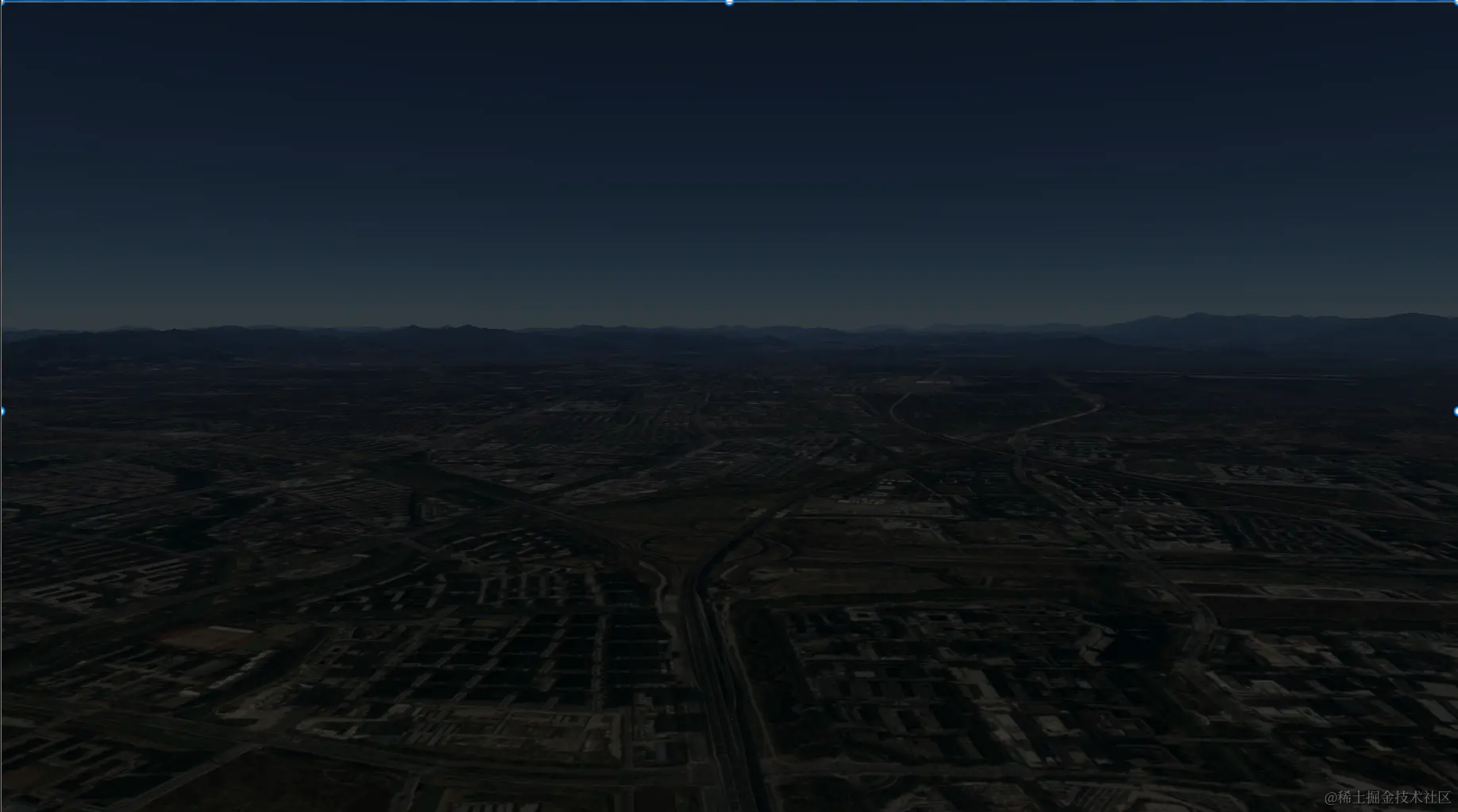 这样可以进一步增强清晨和黄昏的视觉层次感。到此,整个山海鲸的夜空实现就已经全部完成了,而空气透视和Cesium系统已经自动叠加,因此不需要再做更多的处理就可以很好的和gis系统融合在了一起。