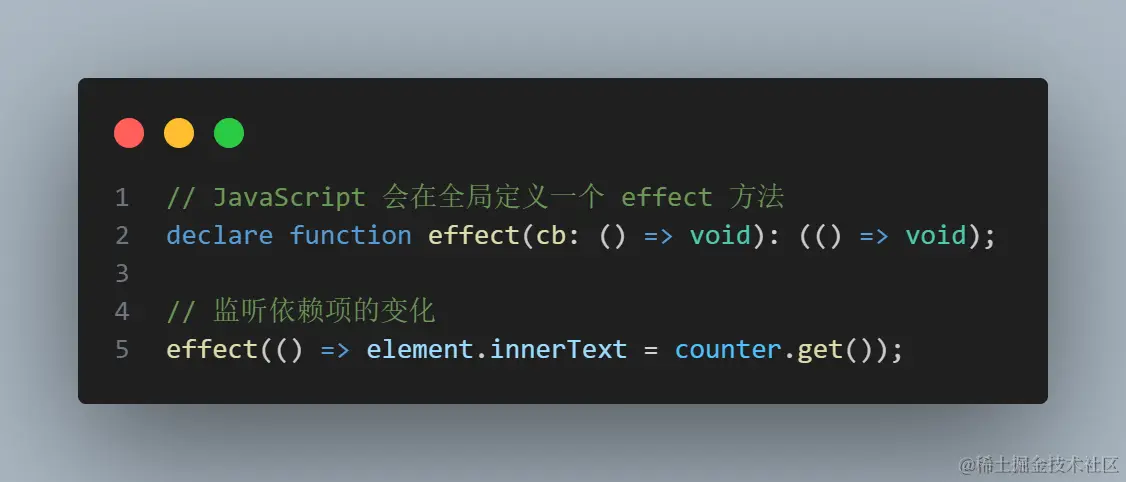 其实 Siganl 是会提供给我们一个 effect 的全局方法,让我们可以监听依赖项的变化,并传入一个回调函数,在回调中去做我们想做的事情