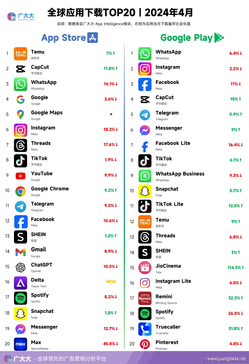 2024年4月全球成功应用App-Google Play 4月下载表现优异的产品有: