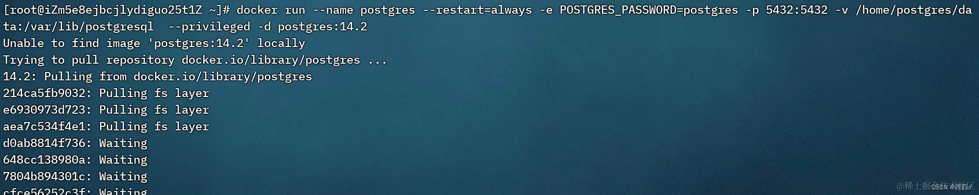 docker run --name postgres --restart=always -e POSTGRES_PASSWORD=postgres -p 5432:5432 -v /home/postgres/data:/var/lib/postgresql --privileged -d postgres:14.2