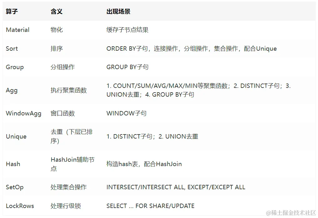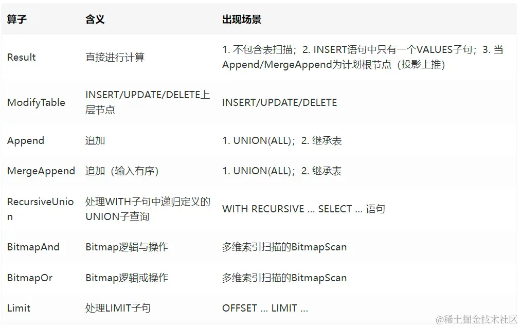 扫描算子用来扫描表中的数据,每次获取一条元组作为上层节点的输入, 存在于查询计划树的叶子节点,它不仅可以扫描表,还可以扫描函数的结果集、链表结构、子查询结果集。一些比较常见的扫描算子如表所示。