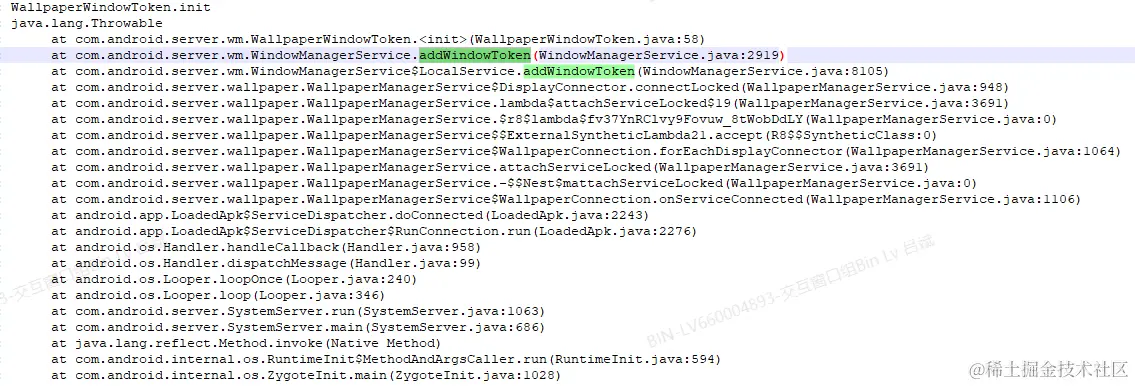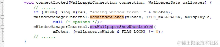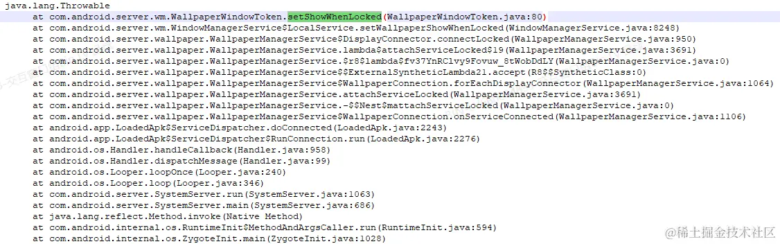 另外根据我本地的测试,当同时设置系统壁纸和锁屏壁纸时,WallpaperWindowToken.setShowWhenLocked这个方法会被调用,设置WallpaperWindowToken.mShowWhenLocked为true,调用堆栈为:
