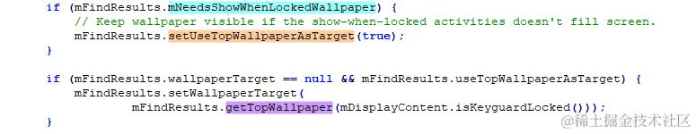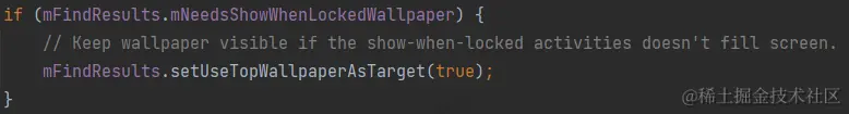 这里承接第4步,如果在第4步我们发现一个非全屏的窗口盖在了锁屏界面上,那么就会将FindWallpaperTargetResult.mNeedsShowWhenLockedWallpaper设置为true。