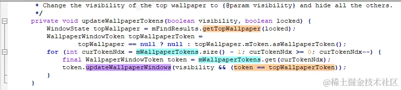 回到WallpaperController.adjustWallpaperWindows中,如果WallpaperController.mWallpaperTarget不为空,那么调用WallpaperController.updateWallpaperTokens设置壁纸的可见性: