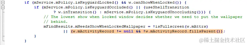 对所有窗口进行mFindWallpaperTargetFunction遍历时,由于google语音助手这个显示在锁屏界面之上的界面对应的ActivityRecord是非全屏的,因此会设置FindWallpaperTargetResult.mNeedsShowWhenLockedWallpaper为true:
