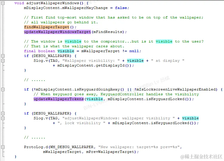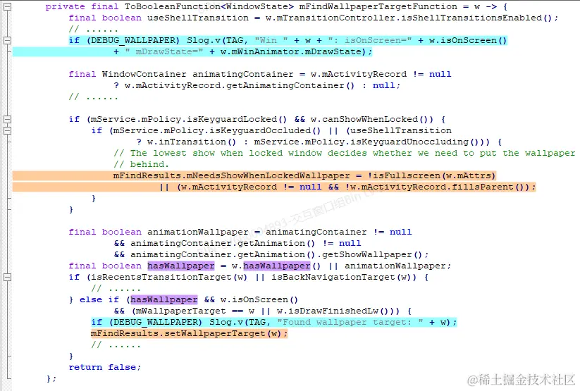 添加了log后,大概知道问题出现的原因了,不过这里先分析一下WallpaperController中关于计算壁纸可见性的一些代码逻辑吧,之前零零散散看过一点,希望这次能够趁分析这个问题的机会,做一些总结。