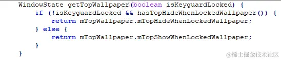 而在后续调用FindWallpaperTargetResult.getTopWallpaper尝试获取壁纸窗口时,由于此时处于锁屏,因此返回的仍然是TopWallpaper.mTopShowWhenLockedWallpaper。这就是问题的原因所在了,我们将壁纸窗口保存在了TopWallpaper.mTopHideWhenLockedWallpaper中,那么TopWallpaper.mTopShowWhenLockedWallpaper就是空的,因此调用FindWallpaperTargetResult.getTopWallpaper返回的就是空的,最终结果就是没有为壁纸找到一个目标窗口,壁纸在锁屏状态下变为不可见。