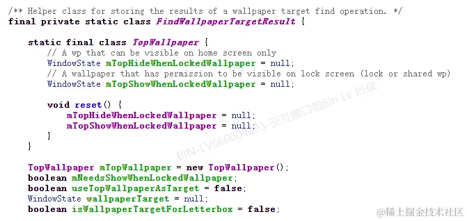 再看它的成员变量,首先是TopWallpaper类型的mTopWallpaper,它又是定义在FindWallpaperTargetResult中的内部类,只有两个成员变量,mTopHideWhenLockedWallpaper和mTopShowWhenLockedWallpaper,结合这里的注释以及我看了代码后的理解: