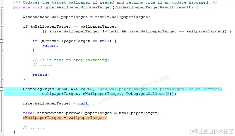 WallpaperController.updateWallpaperWindowsTarget这个方法,我看了下好像没有太多可以说的,就是把上一步寻找壁纸的目标窗口的结果保存到WallpaperController的成员变量mWallpaperTarget中。