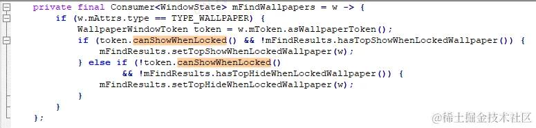 如果这个窗口是壁纸类型的,那么继续判断,如果WallpaperWindowToken.canShowWhenLocked返回true,说明此时壁纸是允许在锁屏界面显示的,那么就将这个壁纸窗口保存在FindWallpaperTargetResult.mTopShowWhenLockedWallpaper中,后续如果我们检测到FindWallpaperTargetResult.mTopShowWhenLockedWallpaper不为空,那么就说明当前壁纸是允许在锁屏界面显示的。否则就将这个壁纸窗口保存在FindWallpaperTargetResult.mTopHideWhenLockedWallpaper中,后续如果我们检测到FindWallpaperTargetResult.mTopHideWhenLockedWallpaper不为空,那么就说明当前壁纸是只能在Home界面显示的。