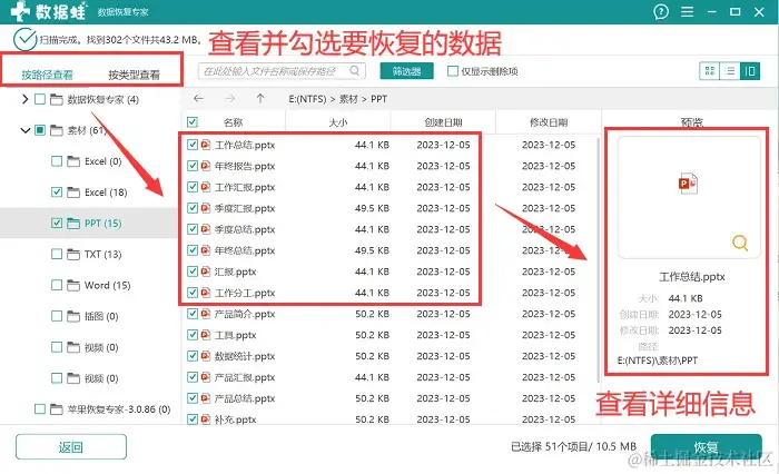 步骤3:扫描完成后,用户可在结果列表中预览并勾选需要恢复的文件,查看时可以选择【按类型查看】或【按路径查看】 ,在界面右侧可查看文件的详细信息;