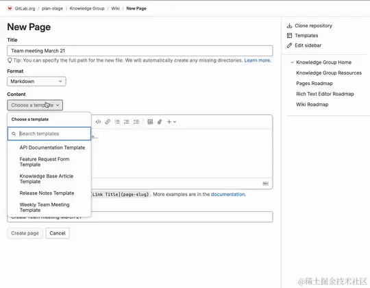 此版本的极狐GitLab 引入了很多全新的 Wiki 模板。现在,你可以创建模板以简化页面的创建或者更新。模板存储在 wiki 仓库的模板目录下。