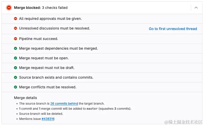 合并小部件清楚地解释了您的合并请求是否不可合并,以及原因。之前,同一时间只能展示一个合并阻塞点。这增加了审核周期而且让你不得不去解决单个的问题,而且不知道是否还有其他的阻塞点。