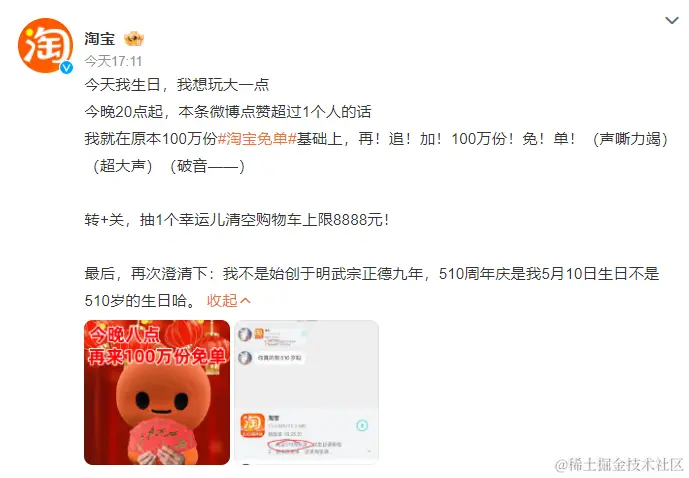 5月6日,大量淘宝用户突然被大规模免单,此前官方并未发布任何活动玩法和游戏规则,随后官方宣布,淘宝周年庆开启了答题免单活动,据悉,活动周期内预计将发放100万个免 单名额。加上五一、母亲节等各种节日促点,今年上半年的淘天似乎一直在“打折”。