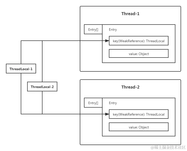 每个Thread里面维护了一个ThreadLocal.ThreadLocalMap变量,底层存储结构为Entry[],ThreadLocal实例作为ThreadLocalMap的key,set/get的值为Map的value,其中,key的引用为弱引用。