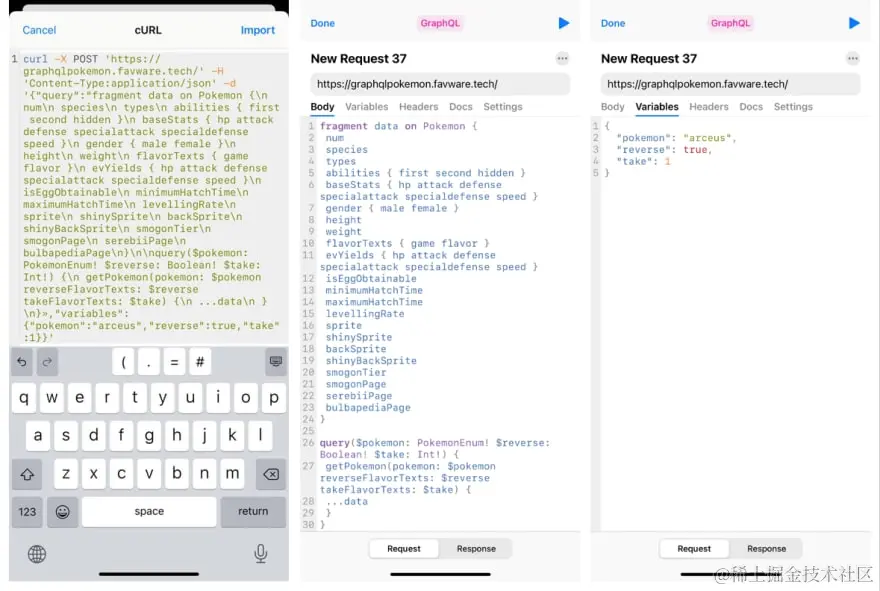cURL 的优点在于你可以传输大量数据。 接下来我们将尝试导入带有查询和变量的 GraphQL 请求: