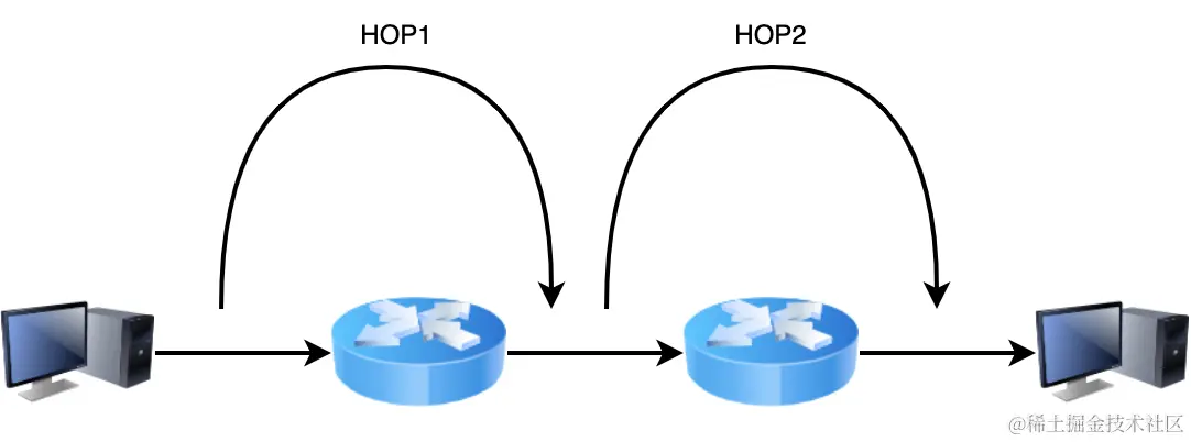 PC1->A->B->C->PC2。我们把两个设备之间看做一个区间,数据包从一个区间传递到下一个区间的行为被称为“HOP”,一般翻译成“跳”。