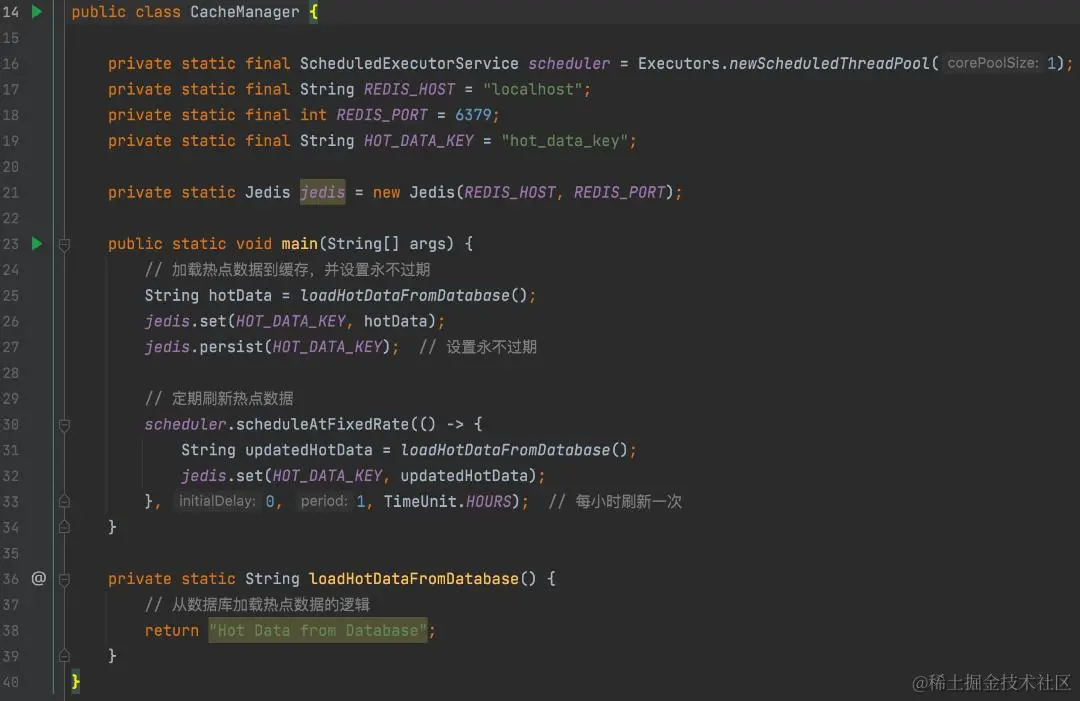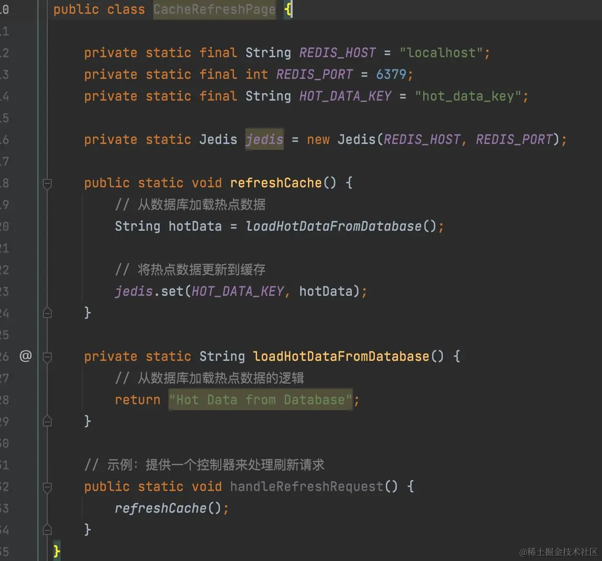 在这个示例中,我们首先将热点数据加载到Redis中,并设置其永不过期。接着,通过定时任务,每小时刷新一次缓存中的热点数据。