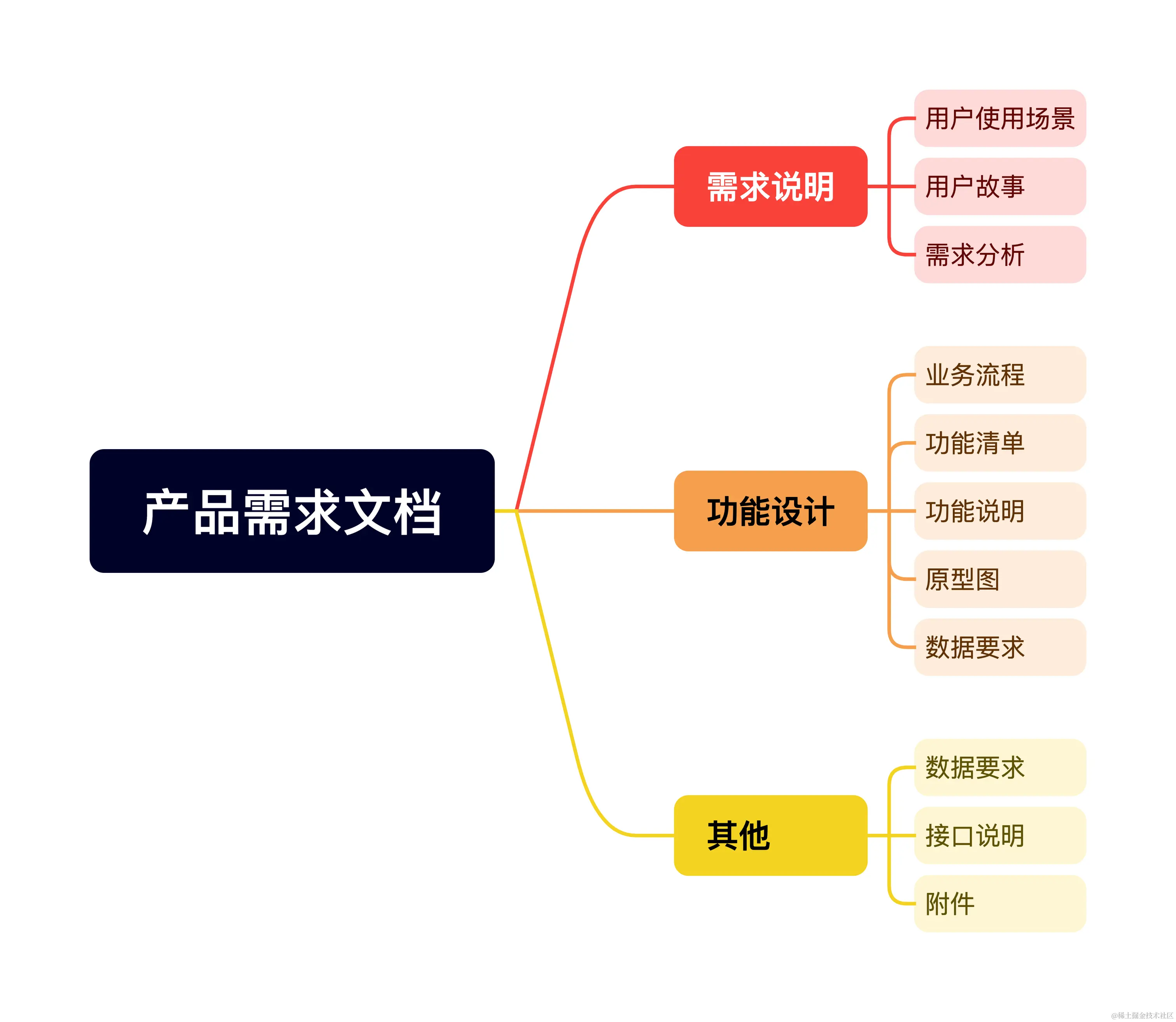 产品需求文档是以需求为单位的描述性文档,用于记录和分析用户需求的使用场景、用户故事、业务流程、功能设计、产品原型、数据要求、影响范围等内容,详情见下方脑图。