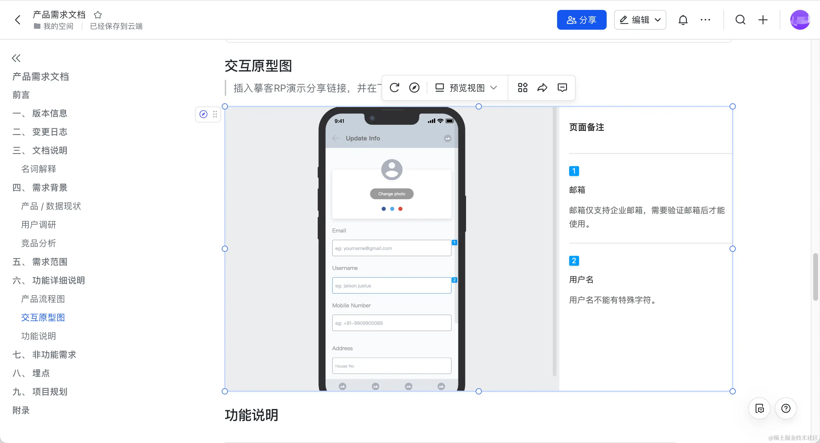 如果工具都采用云端工具,一切都简单了起来,一般在云文档工具中建立知识库,撰写需求说明和业务流程、功能介绍的内容,在云原型设计工具进行详细设计,并将其以链接或iframe预览的形式插入到文档中。如下图所示,我们可以直接看到原型图和原型中的文字标注说明。