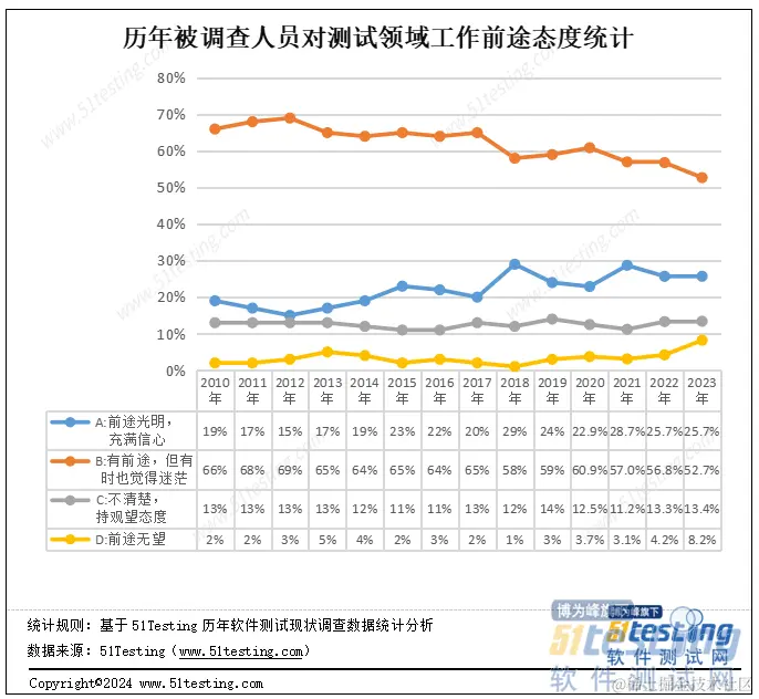 从历年数据可知与2022年相比2023年认为测试领域有前途,但有时也觉得迷茫比例减少了4.1%,这也是2023年所有选项中占比最高的选项,表明大部分测试从业人员对行业还是充满信心的,迷茫表明测试人员还需要进一步明确自己的职业规划,并且切实的付出行动。