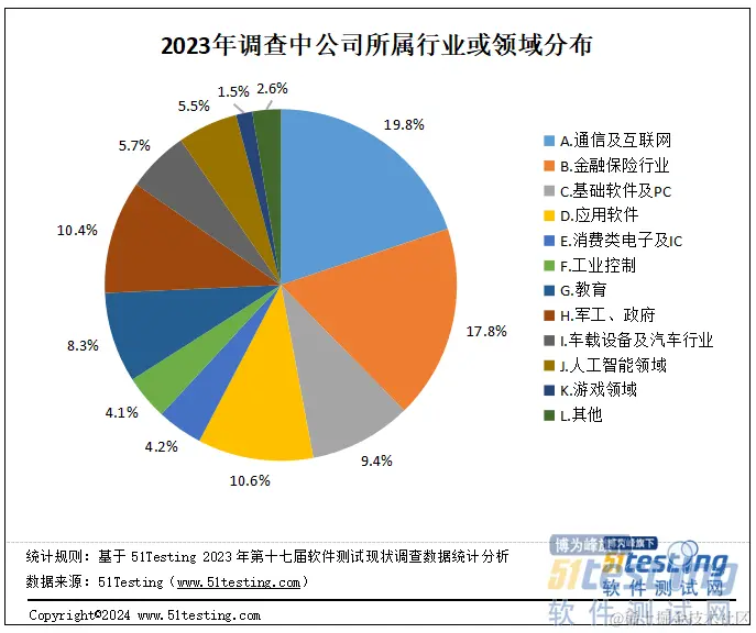 本次调查数据显示,测试人员所属公司行业主要在通信及互联网行业、金融保险行业、应用软件行业和军工政府行业,占总体58.6%。基础软件及PC行业和教育行业占比相近,占总体的17.7%,其他行业的比例略有差异。