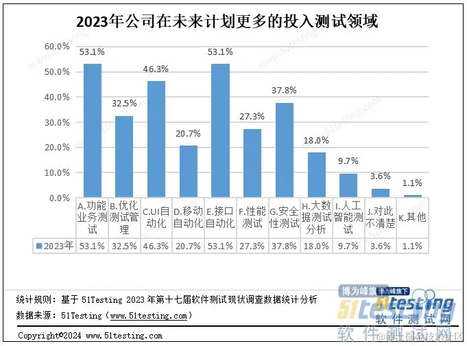 公司未来计划在功能业务测试和接口自动化测试的投入最多,均占53.1%,UI自动化居第三名占比46.3%,其他选项均有占比。