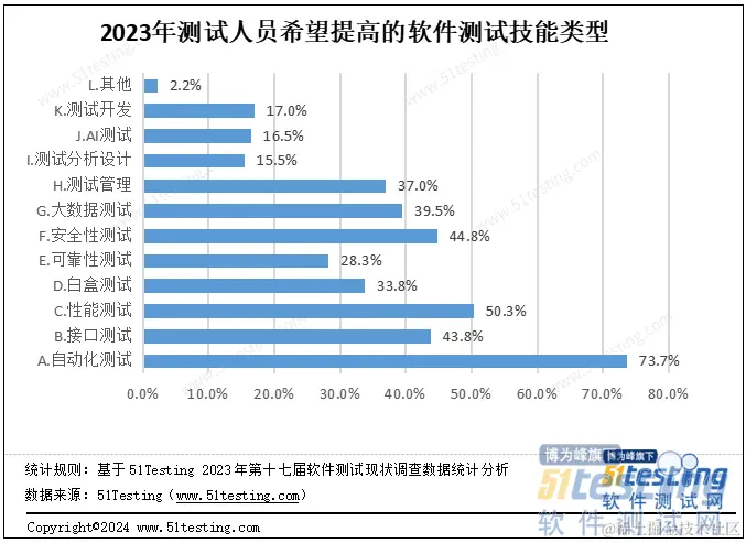 从调查数据中我们可以了解到软件测试从业人员最希望提高的技能是自动化测试,占73.7%;其次是性能测试,占50.3%;安全性测试占44.8%;接着就是接口测试和大数据测试以及测试管理,分别占43.8%、39.5%和37.0%;白盒测试占33.8%;可靠性测试和测试开发,分别占28.3%和17.0%;测试分析设计和AI测试占15.5%和16.5%;其他选项占2.2%