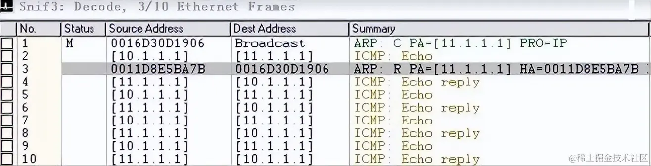 显然这个ARP广播是可以被B收到的(因为他们同处一个VLAN),而11.1.1.1正好就是B的IP地址,理所当然B要回应这个ARP请求。下图是A上的抓包情况,A首先进行了ARP广播,然后收到了B的应答。