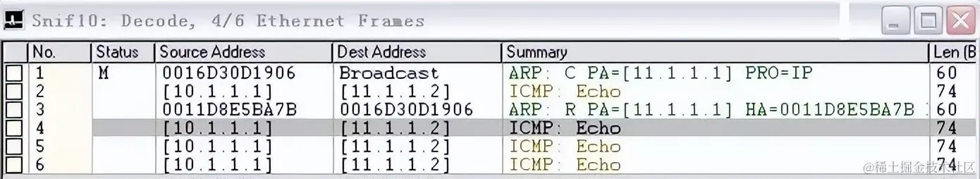 与第2种情况不同的是,这里可以明确知道ARP中的11.1.1.1指的是ping中所指定的IP地址而不是网关(此时A网关是10.1.1.1了)。