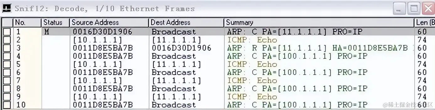 A发出了关于11.1.1.1的ARP广播请求,B对11.1.1.1做出应答,但是下面接到了多个B发来的关于100.1.1.1的ARP广播请求,且100.1.1.1的请求没有得到B的应答,看来B是一直在试图查询B的网关(100.1.1.1)所对应的MAC,在网关的MAC没有获得应答之前,B不会对ping产生回应。