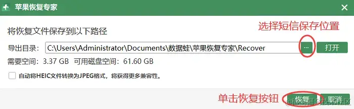 步骤4:接着会弹出恢复文件保存的路径窗口,在**【…】选择好短信保存路径,单击【恢复】**按钮即可。