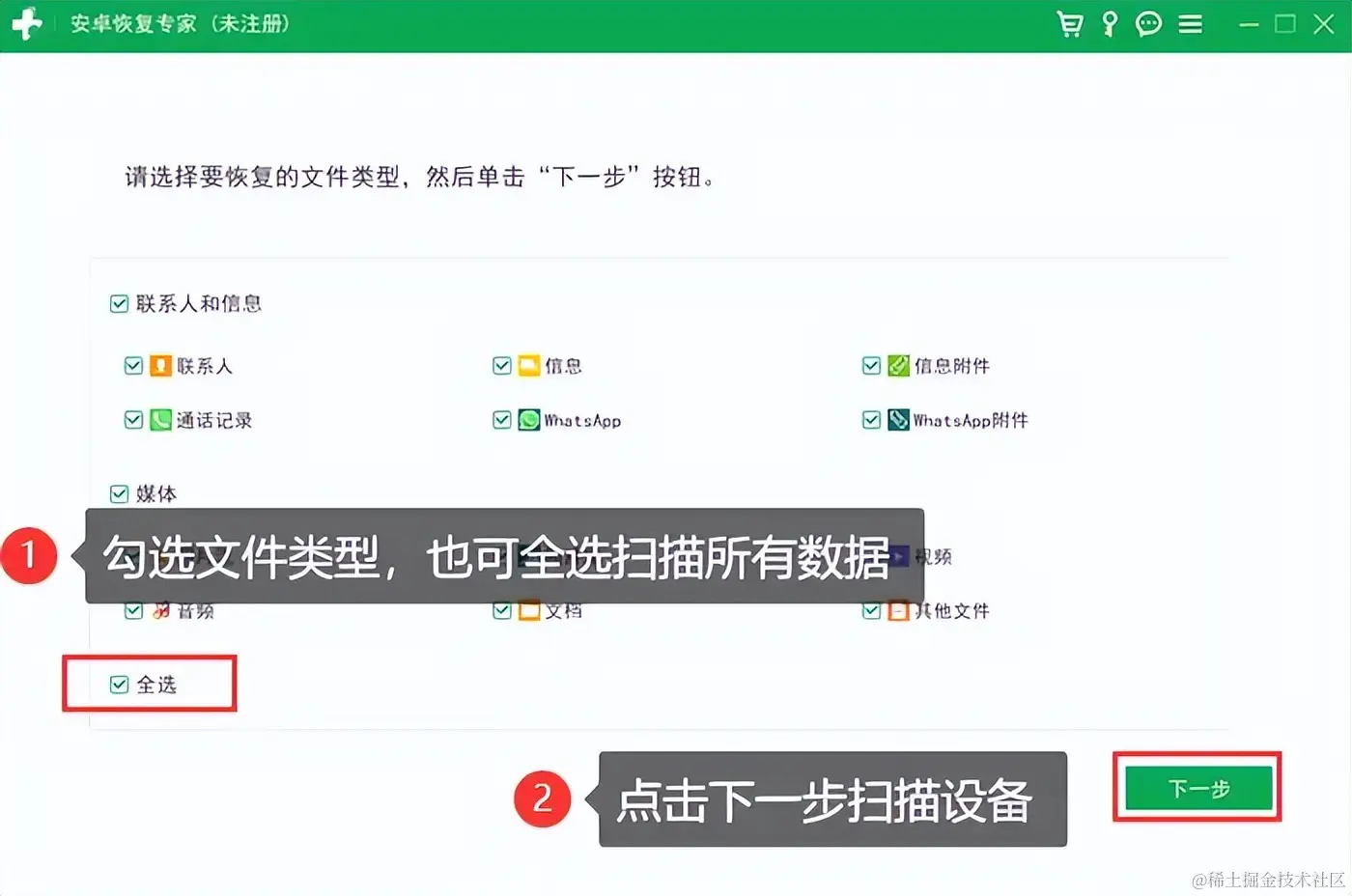 步骤2:连接完成后根据软件的页面和提示,选择适合手机数据恢复的选项,例如文件类型可根据自己所需要的来勾选,也可全选,选择完成后点击 【下一步】 即可开始扫描手机内的数据。