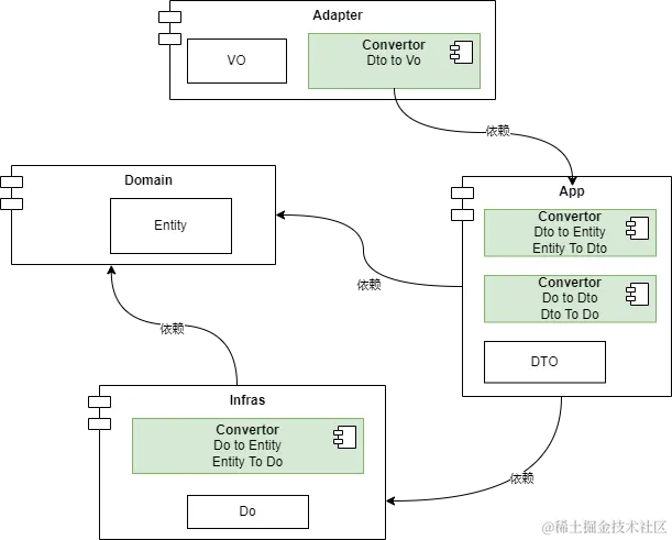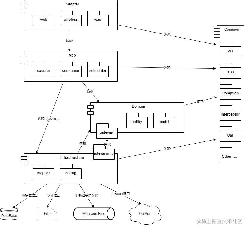 主要负责技术细节问题的处理,比如数据库的CRUD、搜索引擎、文件系统、分布式服务的RPC等。此外,Infrastructure层还肩负着领域防腐的重任,外部依赖需要通过Gateway的转义处理,才能被App层和Domain层使用。