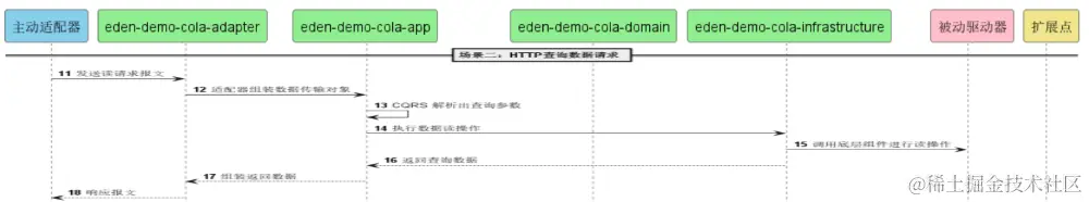由客户端发起请求,首先Adapter层接收请求,进行相关的校验后进行数据封装(Coverter操作:由请求参数封装为App层所需要的DTO结构),根据预设的逻辑去调用App的内容;DTO数据进入App后, App根据业务诉求,然后调用Domain的ability和module进行业务组装(Converter操作:将DTO转换为Entity对象);被调用的Domian在进行业务处理过程中调用Infras层去进行相关持久化和查询;Infras在被Domain调用时,需要把传入的Entity转换为内部对应数据的DO对象。最后逐层返回,相应的在Adapter层将DTO转为VO