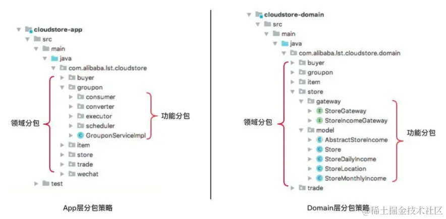 然后就是关于每个module的代码目录划分原则(基于领域维度进行划分),即每个module中对应的概念都划分到具体某一功能领域包中: