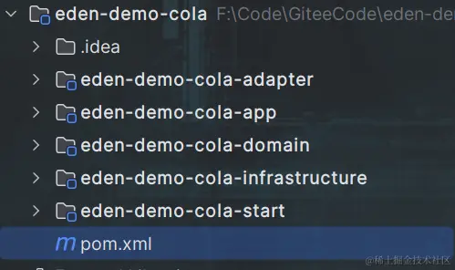 使用作者推荐的maven Archetypes模板后,能发现COLA整体采用maven module的结构来构建代码,划分原则是结合技术维度和领域维度综合划分: