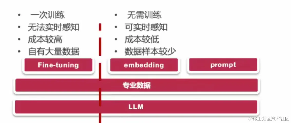 适合数据样本比较少的这种场景。如你有一本书,你希望说从这本书上去得到一些信息,但是你又不想去读它,你希望有个机器人,你问他问题,他直接从书里面找到答案。这种就可以把书的数据作为专业数据,然后嵌入到我们的这个LLM,然后再通过prompt方式去引导,得到一个精确的答案。