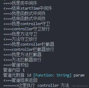 所有的中间件->controller上的守卫->controller上的拦截器->方法上的守卫->方法上的拦截器->管道